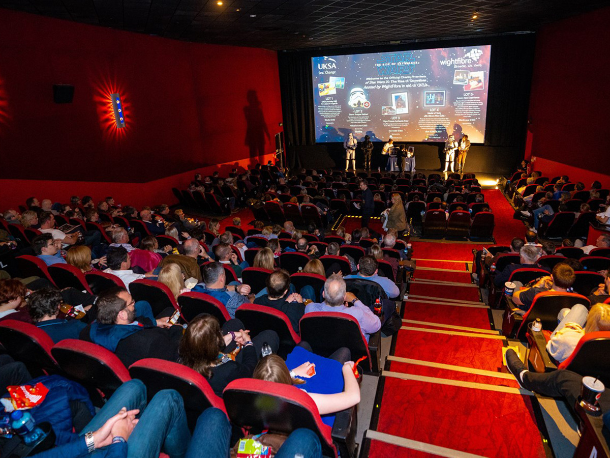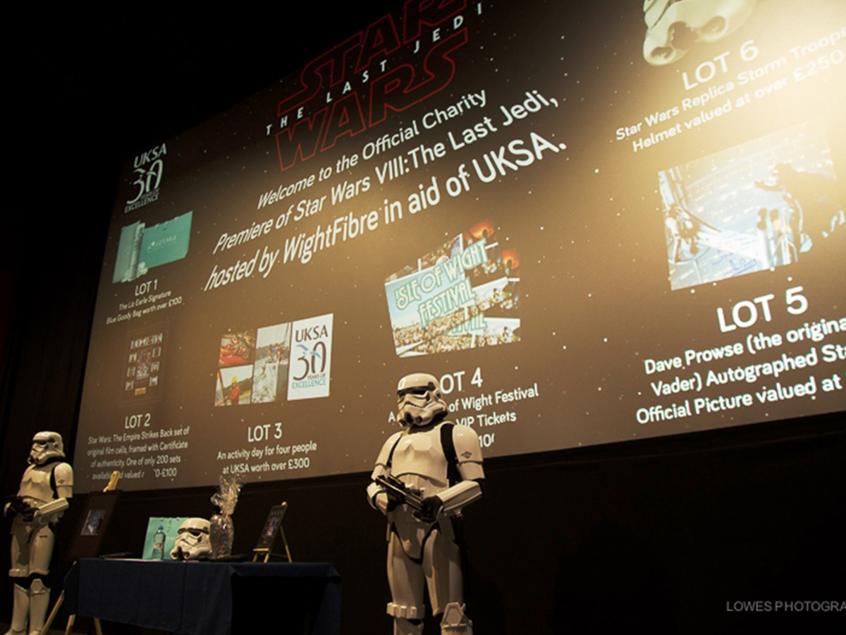 Our biggest Star Wars Official Charity event to date, raising £7,158 and taking our total to over £15,000 for UKSA. VIP guests walked the red carpet and rubbed shoulders with characters from the popular film series including Darth Vader, Storm Troopers and Hans Solo, before moving into Screen 1 to take their seats. The event dedicated to Simon Poole, WightFibres’ Chief Operating Officer, who tragically lost his life only a few days prior to the event.